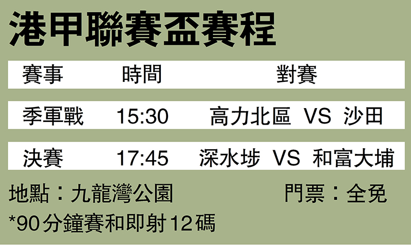 香港文匯報訊(記者 黎永淦)香港超級聯賽腰斬之後,目前代表着本地足球最高水平賽事的香港甲組聯賽盃今日煞科。決賽由準備升上港超的地區球隊深水埗與和富大埔狹路相逢;高力北區及沙田則會在頭場季軍戰會師。兩場賽事都安排在只得1,200個座位的九龍灣公園上演,而且不收門票,假若天公造美,可望高朋滿座。