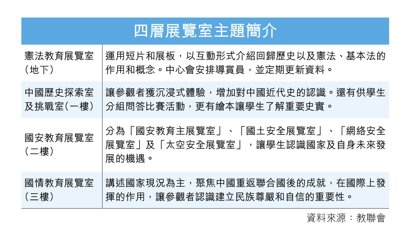 中心通過四個主題展覽室提供沉浸式體驗(見表),黃錦良舉例如一樓的「中國歷史探索室及挑戰室」,會以AR(擴增實境)、VR(虛擬實境)等多媒體形式展現中國近代史;三樓的「國情教育展覽室」則設有「香港聯合國教科文組織協會模擬聯合國會議」,讓同學可以開展不同活動,「整體是希望結合多元化、有趣的方式,讓同學認識國情、歷史,國家憲法、基本法及香港國安法等等」。