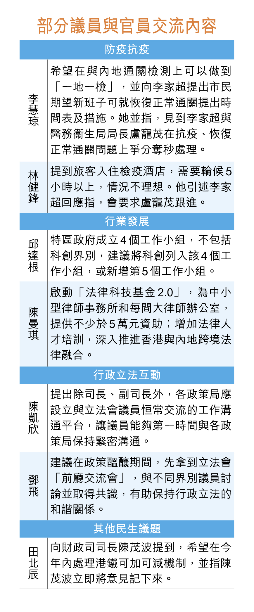 李家超昨日率領3名司長及3名副司長,一同出席首次立法會「前廳交流會」。李家超在會後指,大家在交流會上很積極,氣氛非常良好,在討論時亦很坦誠,亦提到了實際問題和一些想法,他對此非常滿意。他認為,第一次交流會有這個成績,令他更有信心將「前廳交流會」發揮得更完善和對大家更有作用,最終令整體市民受惠。
