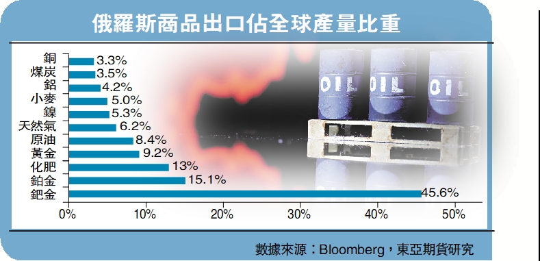 俄羅斯國土面積廣闊,資源豐富。2021年全球貿易數據顯示,俄羅斯在國際商品交易市場上為全球供應了45.6%的鈀金、15%的鉑金、13%的化肥,全球能源市場上8.4%的原油和6.2%的天然氣來自俄羅斯。可見,在全球商品交易版圖上,俄羅斯有着舉足輕重的地位。