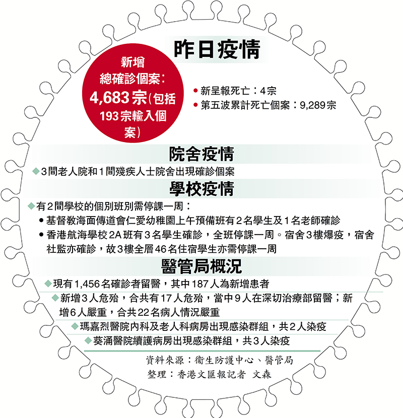 香港昨日新增4,683宗新冠肺炎確診個案,包括193宗輸入個案。特區政府醫務衞生局局長盧寵茂昨日表示,由於目前有逾半數輸入個案均在機場成功阻截,故特區政府擬在「精準防疫」原則下放寬抵港檢疫措施,包括研究縮短抵港人士酒店隔離日數至5天或者更少日數,而在居家隔離期間,抵港者必須使用「黃碼」,以及隔天接受一次核酸檢測。特區政府專家顧問、中文大學呼吸系統科講座教授許樹昌昨日表示,由於目前輕症多、重症少,香港醫療系統仍能負擔,因此有條件縮短抵港人士酒店檢疫日數。