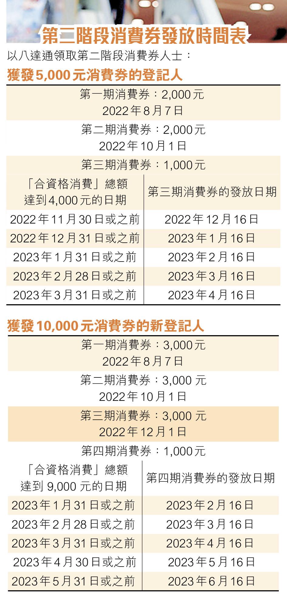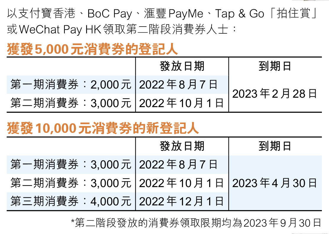 政府昨日公布「第二階段消費券」獲核實資格的約636萬名市民,將於下周日(7日)獲分期發放消費券。獲發5,000元消費券的市民將分兩至三期領取;獲發10,000元消費券的新登記香港永久性居民或新來港人士,則分三至四期領取(見表)。為配合消費券的推出,各大商戶近日均推出多項優惠,吸引市民消費、刺激經濟。