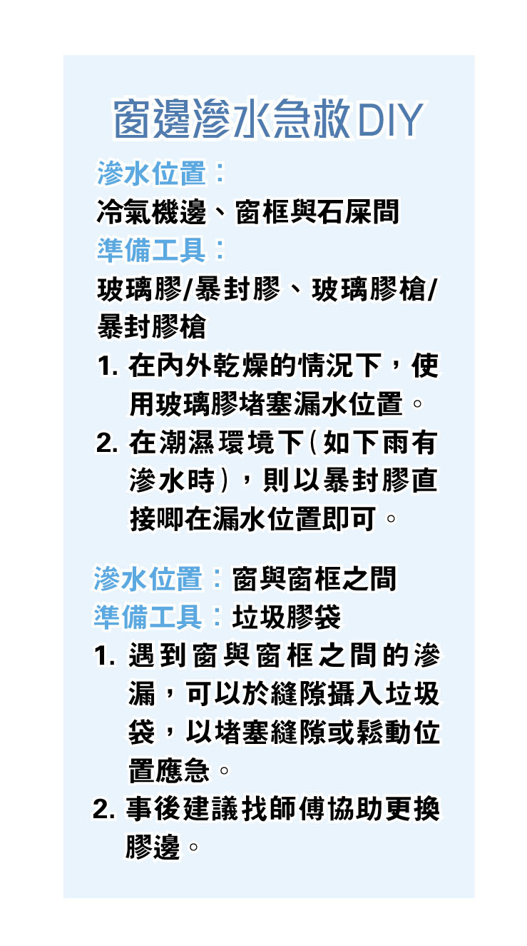 這種情況嚴格而言是屬於大廈維修範疇,戶主應該首先向大廈管理公司反映,讓他們檢查大廈外牆。但若急需要處理窗台漏水問題,可以使用透明防水膠膜急救。只需用油掃將防水膠直接塗抹在窗框邊以及外牆牆身上,無需加水稀釋,這樣膠漆便會形成防水膜,防止雨水滲入牆身。