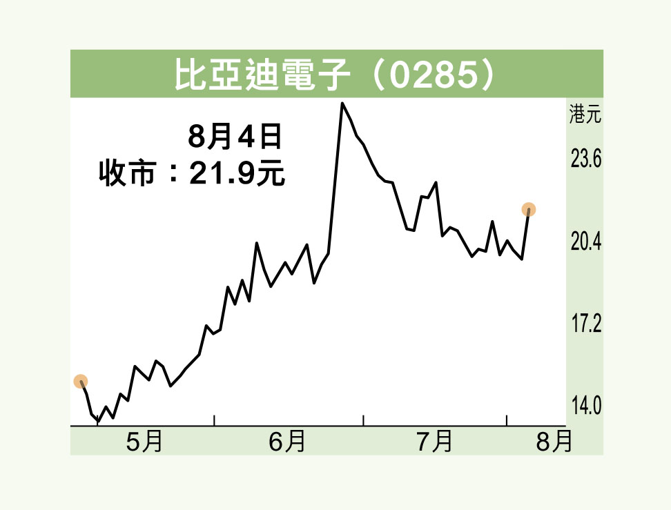 比電今年首季業績未如理想,惟觀乎來自北美大客戶蘋果產品的份額持續提升,令期內組裝收入升近八成,旗下電子煙又傳出獲生產許可,加上母公司比亞迪股份(1211)的新能源車銷量大增,也可直接受惠,相信對已作調整的股價亦有正面的提振作用。