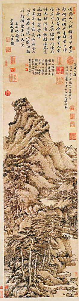 如此濃密的群山峻嶺,猶如築起一道天然的涼棚,所以說,炎炎夏日,觀賞這樣一幅山水畫,心自然是感到涼爽的。王蒙喜用枯筆、乾皴,多用解索皴、牛毛皴或細筆短皴,間用小斧劈皴。此畫中,山體施以細密而短促的牛毛皴,凸處和邊緣處筆少而墨淡,凹處及深暗處則筆多而墨濃,藉以表現出山巒的層次和體積感。松樹以淡墨勾形,偶爾施以重墨。松針則先用淡墨勾勒,復施以濃重的焦墨,使之層次分明,愈顯清峭挺拔之勢。山間叢樹用焦墨側鋒點染而成,與山體皴染融為一體,相輔相成,更添夏日青山渾厚質感。