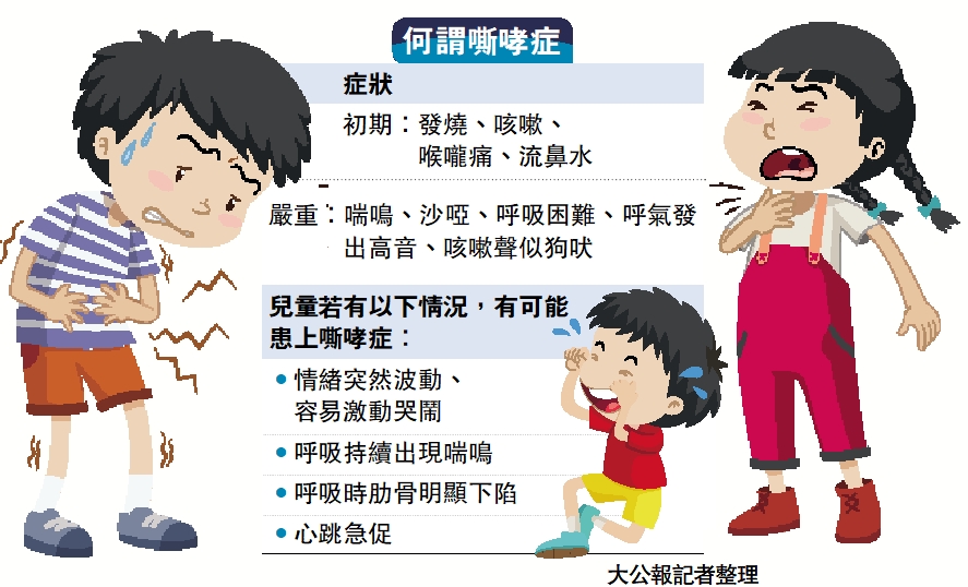 嚴重:喘鳴、沙啞、呼吸困難、呼氣發出高音、咳嗽聲似狗吠