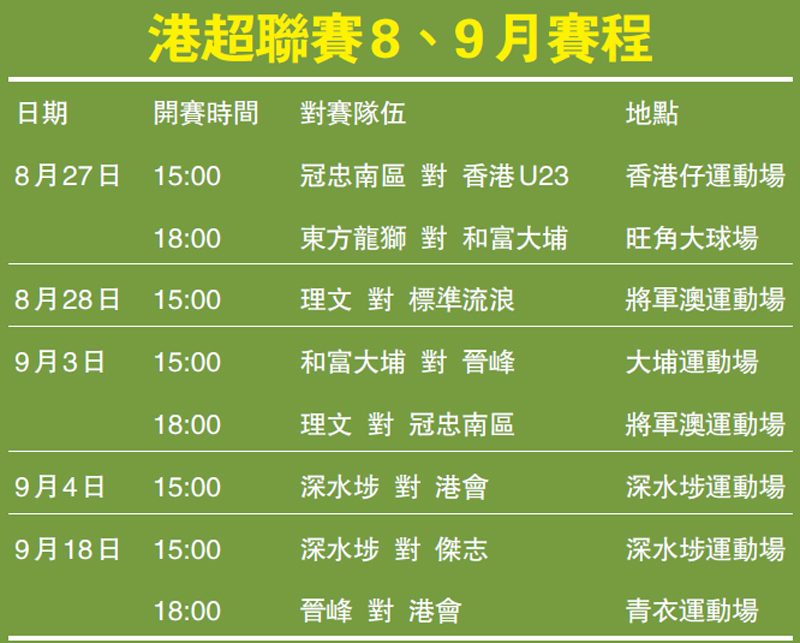 港超首周聯賽只安排3場賽事,傑志對深水埗及晉峰對港會都延期至9月18日舉行。下月亦有東方龍獅出戰亞協盃,加上香港U20代表隊及國際足協編定的國際賽期,因此賽程也已作出相應調整。