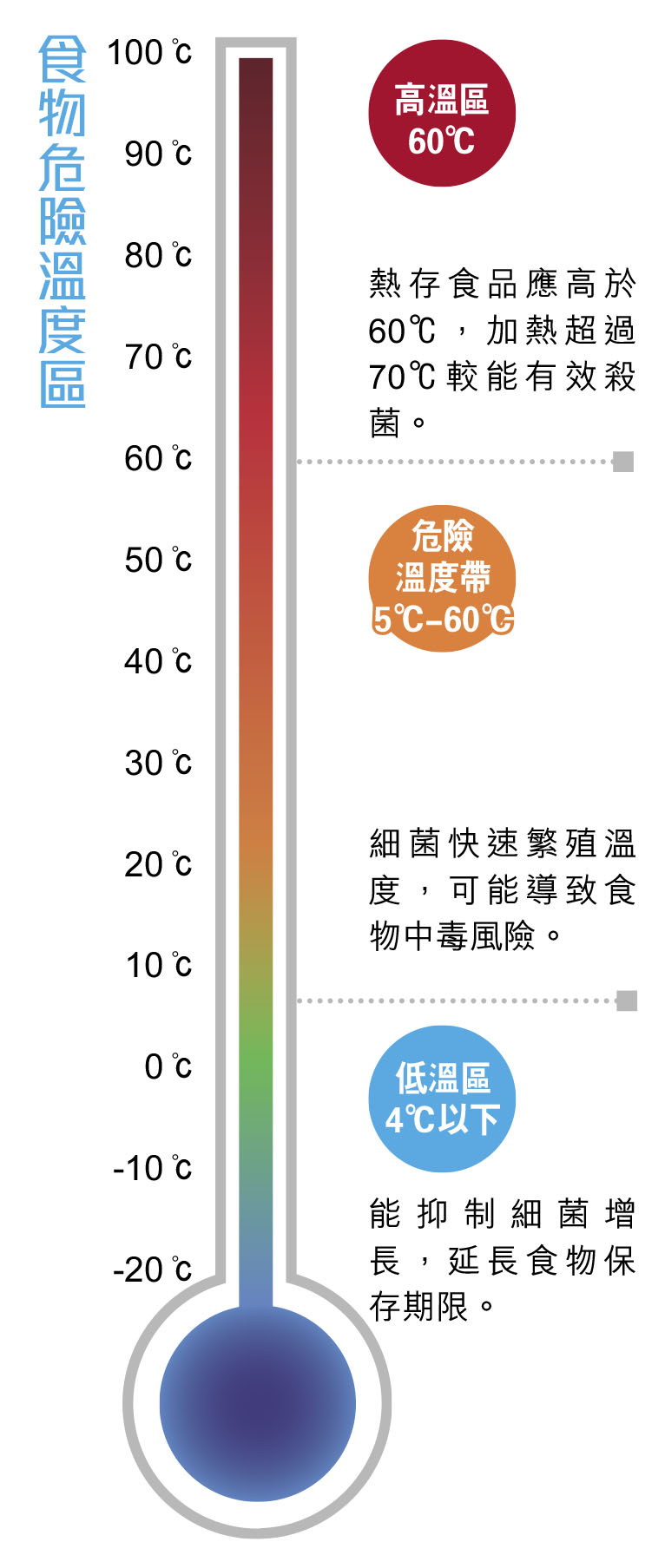 除新冠病毒外,濕熱天氣特別容易滋生細菌,當中5℃至60℃是危險溫度區,如將冷藏食物長時間放在這溫度區或室溫中解凍,有機會加促細菌繁殖,引致食物中毒。冷藏肉類的溫度一旦高於攝氏4℃,冷藏前已存在於肉類中的細菌便可再度活躍起來並開始繁殖。因此,冷藏肉類應放在攝氏0℃至4℃的雪櫃內解凍。為了防止肉類的汁液滴下至即食食物上造成交叉污染,應把肉類放在防漏的容器或包裝中。如需快速解凍冷藏肉類,可用流動的冷水或微波爐解凍。不過,這兩種方法會使肉類部分或全部置於有利細菌滋生的危險溫度範圍,因此經解凍後的冷藏肉類必須立即烹煮。某些食品無需解凍便可烹煮,例如冷藏雞塊、冷藏餃子等。然而,未經解凍的肉類不宜直接以慢煮鍋烹煮,因為肉類置於危險溫度範圍的時間可能會過長,令有害細菌可以迅速增長。