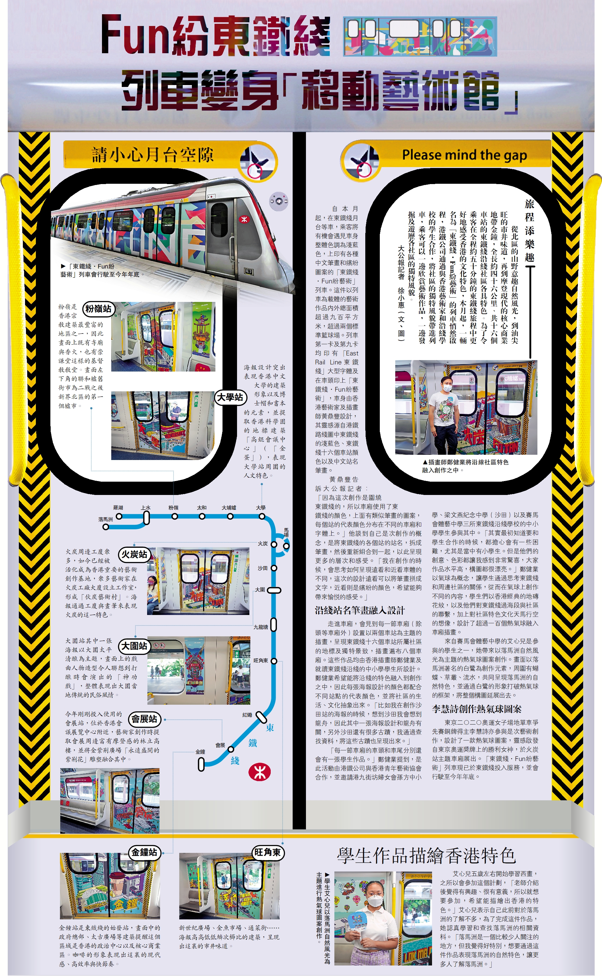 從北區的山野意趣自然風光,到油尖旺的市井味道,再到摩登現代的核心商業地帶金鐘,全長約四十六公里、共十六個車站的東鐵綫沿綫社區各具特色。為了令乘客在全程約五十分鐘的東鐵綫旅程中更好地感受香港的文化特色,本月起,一輛名為「東鐵綫·Fun紛藝術」的列車悄然啟程,港鐵公司通過與香港藝術家和沿綫學校的學生合作,將社區的獨特風貌帶進列車,乘客可以一邊欣賞藝術作品,一邊發掘及遊歷各社區的獨特風貌。\大公報記者 徐小惠(文、圖)