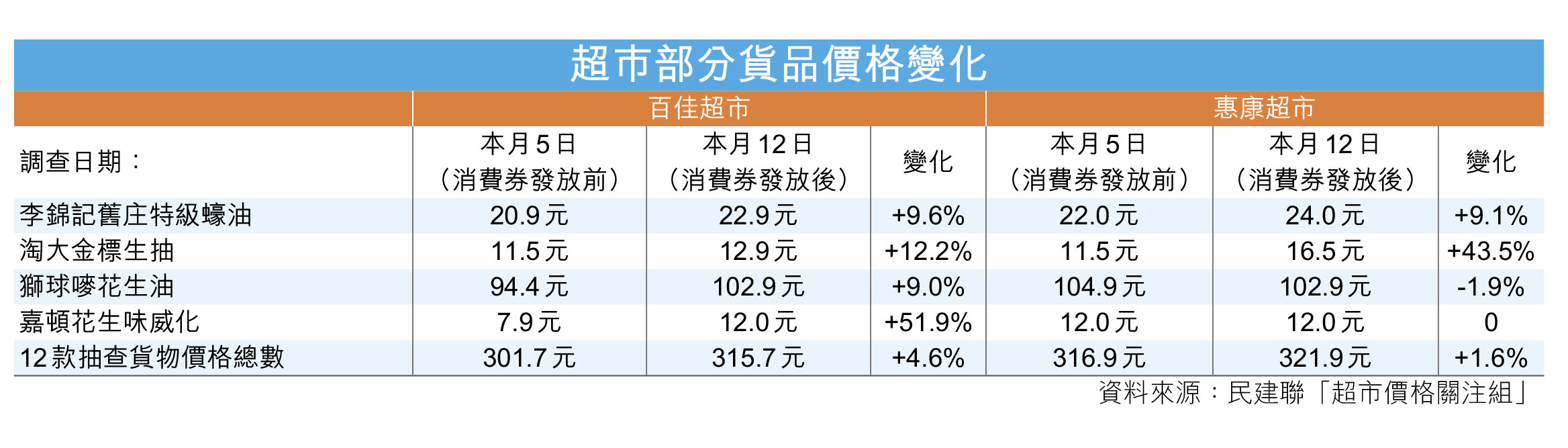 政府消費券發放後也現加風,其中惠康12款貨品整體售價升1.6%,百佳更加價4.6%。曾榮輝表示,兩大超市在第二階段消費券發放後貨品售價均有上升,當中百佳所售的嘉頓花生味威化(200克)更加價五成一,惠康所售的淘大金標生抽500毫升也加價四成三。