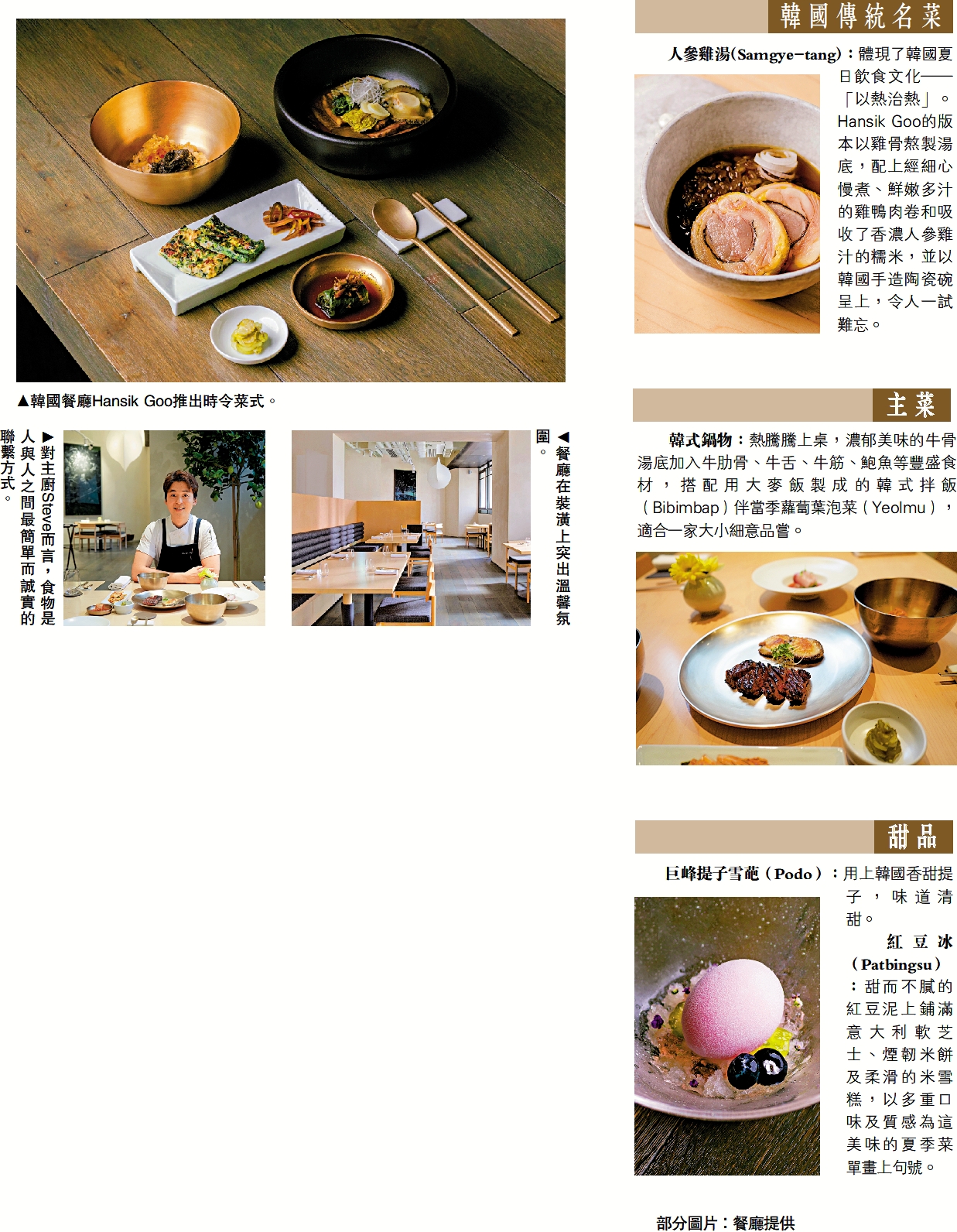 韓式鍋物:熱騰騰上桌,濃郁美味的牛骨湯底加入牛肋骨、牛舌、牛筋、鮑魚等豐盛食材,搭配用大麥飯製成的韓式拌飯(Bibimbap)伴當季蘿蔔葉泡菜(Yeolmu),適合一家大小細意品嘗。
