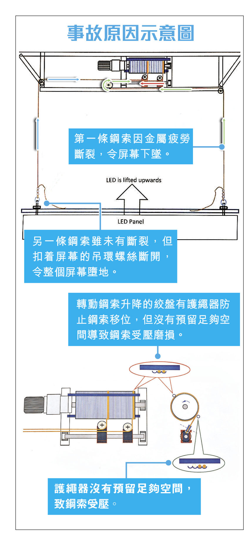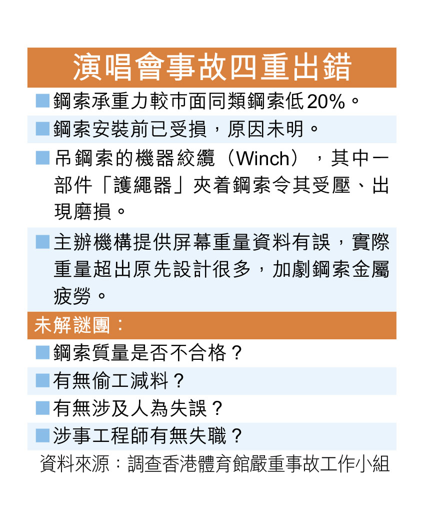 男團MIRROR上月在紅館舉行的演唱會發生大型屏幕墜下壓傷舞蹈員事故,負責調查的工作小組昨公布初步調查結果,發現吊起屏幕的兩條鋼索,其中一條斷裂,另一條的吊環螺絲又飛脫,疑是金屬疲勞導致,主要有四大原因,包括鋼索承重能力較巿面同類鋼索低20%、「護繩器」(rope guard)未有預留足夠空間等(見表)。有業內人士向本報表示,事件反映涉事承辦商及工程師不夠專業,工程師未能做到監工角色,連屏幕重量也搞錯是低級錯誤,建議康文署日後加強監管演唱會安全。