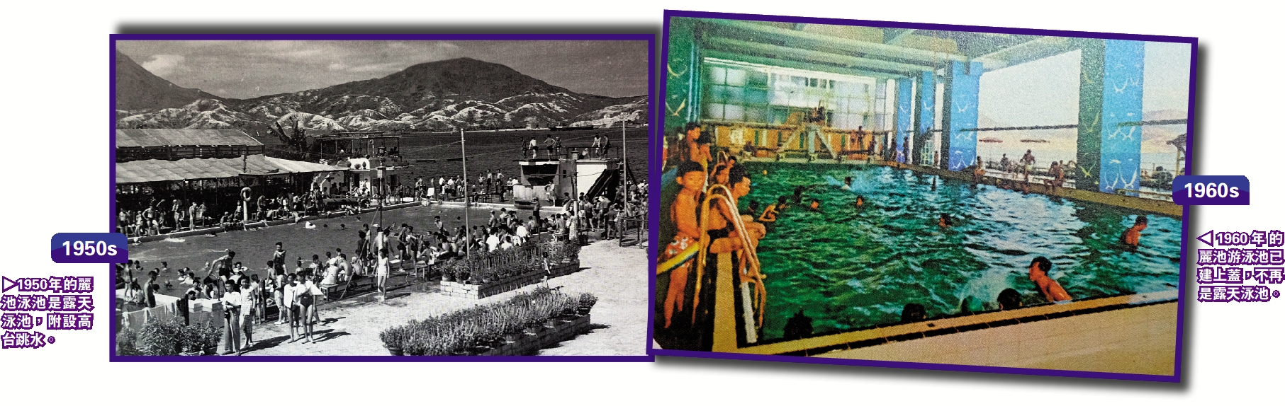 右圖:1960年的麗池游泳池已建上蓋,不再是露天泳池。