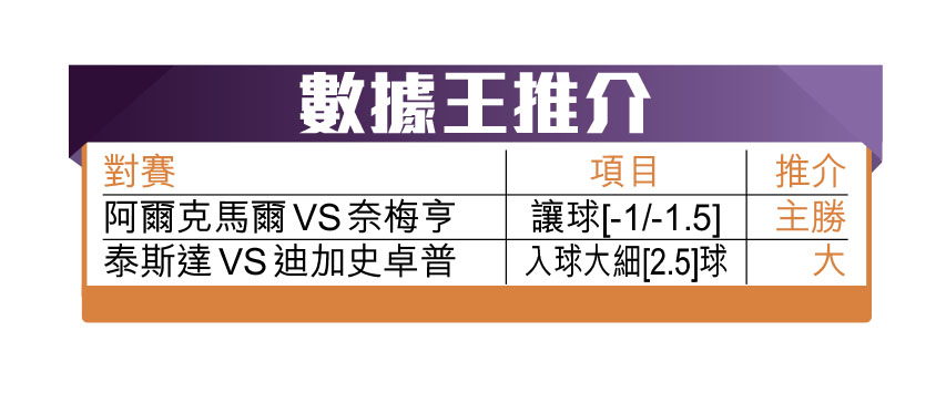 阿爾克馬爾是荷甲傳統三強以外的二班頂球隊,實力不俗,上季亦位列聯賽榜第5。今季該隊在荷甲亦錄得3戰全勝,在歐協聯亦連場報捷,近期在各項賽事累積6連勝,士氣與狀態一流,面對聯賽開季3戰勝和負各一的奈梅亨,被秤先合理。此外,細看兩軍今季「讓球」盤口,AZ在3戰中有1次收足全個盤,其餘2次則有半格進賬,總之3場波的亞洲盤都有錢收。反觀奈梅亨3場亞洲盤則是1贏2輸,始終該隊實力不及,又要作客,今場睇怕會大敗收場。