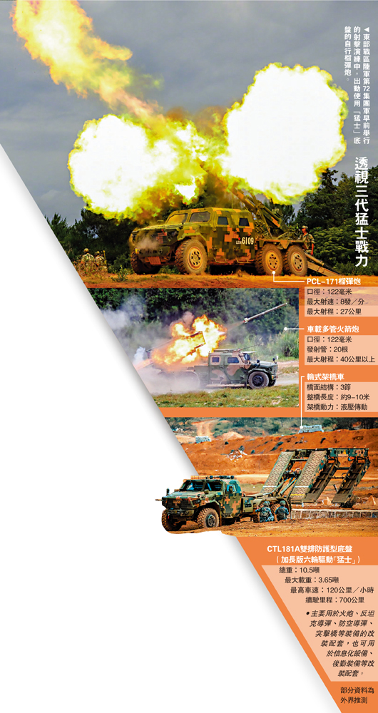 駐防東南前線的東部戰區陸軍第72集團軍近日舉行跨晝夜連續射擊演練,輕型合成旅炮兵分隊出動加長版六輪驅動「猛士」戰車底盤的自行榴彈炮(俗稱卡車炮)、火箭炮輪番打擊,高強度連續作戰。「猛士」底盤輕型裝備,具有打擊火力猛、機動性能高等優勢,基於此底盤研發的122毫米卡車炮等裝備可通過空軍、海運迅速部署,支援奪島登陸部隊衝鋒。\馬浩亮(文)