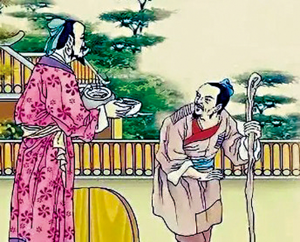 而有位叫黔敖的人就在大路旁擺上一些食物,帶有飢餓的人經過時,就施捨些食物給他們。一日,黔敖又坐在路邊的車上,等着飢餓的人經過。只見一個餓得腳步虛浮的人搖搖晃晃地走着,身上的衣衫破破爛爛。黔敖見此情景,就左手拿着乾糧,右手端起一碗水,對着那人叫道:「喂,過來吃!」