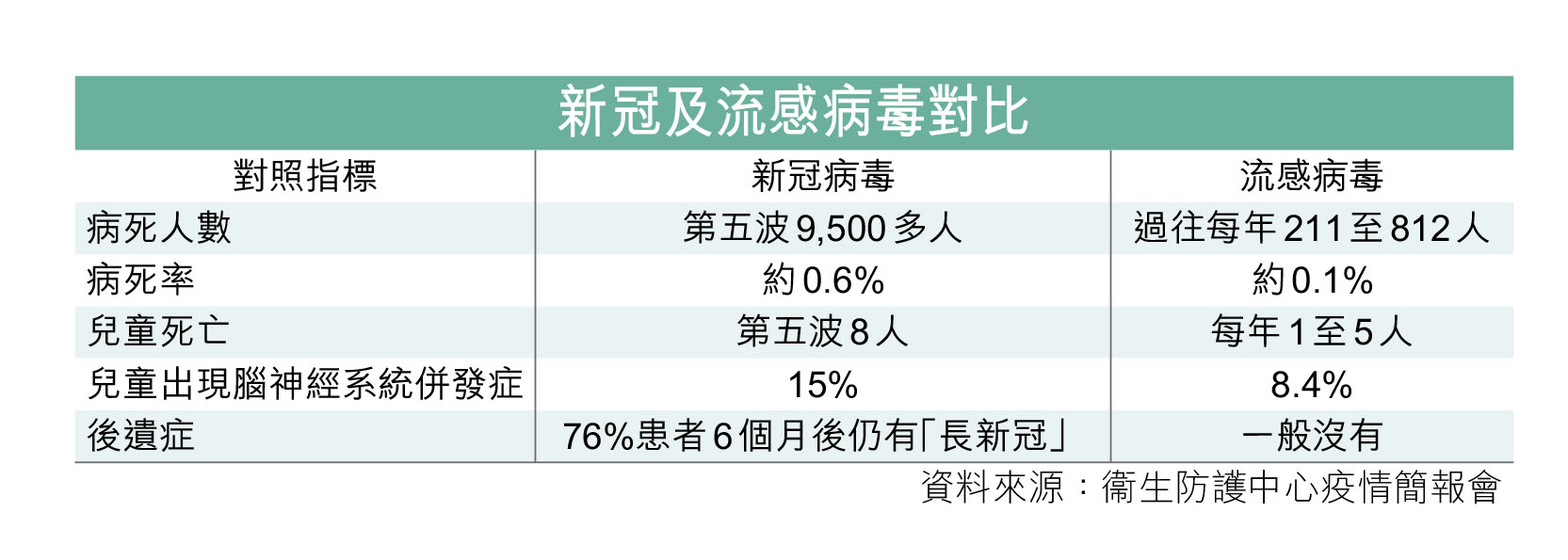 同時,根據香港大學的研究,第五波期間因新冠而住院的1,144名11歲或以下兒童,入住兒童深切治療部及死亡率分別為1.8%及0.2%,較季節性流感高兩倍或以上,而腦神經併發症包括腦炎風險更高達15%。大約10%至20%的新冠患者會受病毒中長期影響,而「長新冠」對個別人士(尤其是兒童)可能會有多個器官受到影響或出現自身免疫系統疾病,長遠對醫療系統造成負擔。至於流感患者,一般會在一兩個星期完全康復,並不會造成長遠健康影響。