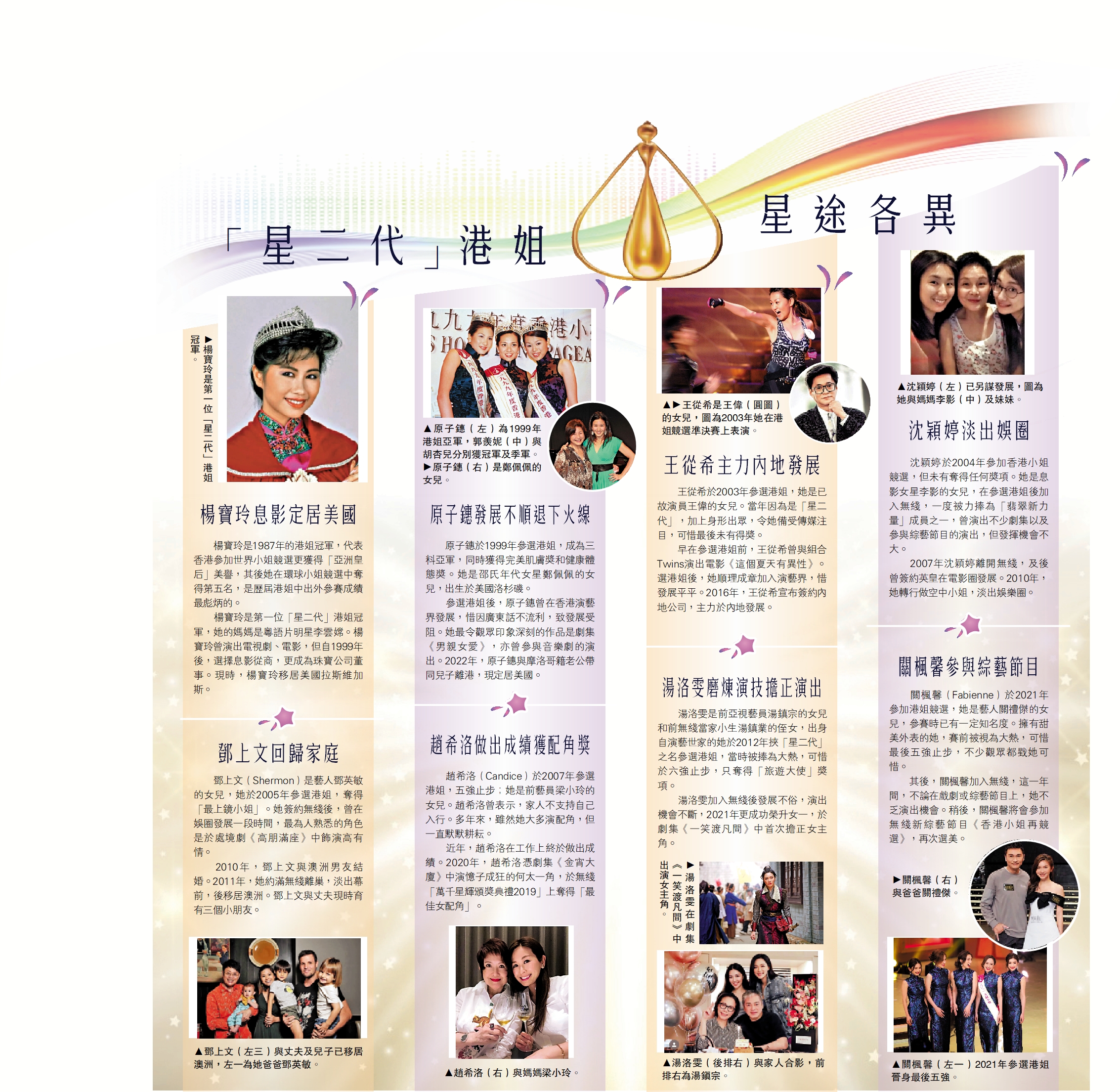 楊寶玲是1987年的港姐冠軍,代表香港參加世界小姐競選更獲得「亞洲皇后」美譽,其後她在環球小姐競選中奪得第五名,是歷屆港姐中出外參賽成績最彪炳的。
