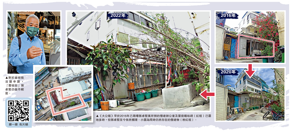 現年82歲的郭卓堅長期利用司法程序挑戰政府博出位,但他本人亦長期違法。2016年被《大公報》踢爆其位於長洲東堤小築4座F室地下寓所,前面及側面有僭建鐵皮屋及其他結構物,屋宇署自2010年多次就該僭建物違反《建築物條例》第14條而發出清拆令,亦曾向業主檢控及被判罰款至少一次約6000元。然而,郭一直砌詞稱他只是租客不是業主,該僭建的100多平方呎鐵皮屋「唔關我事」。昨日記者再到涉事上址發現,已逾13年的僭建物絲毫沒有清拆,郭繼續狡辯稱:「鐵皮屋係法團的『辦公室』,入面的設備有閉路電視和煙霧感應器的終端,萬一有人燒炭會馬上有通知,曾經救過幾個人。」他更聲稱屋宇署曾派人來巡查,人員得知設施是用來救人後「隻眼開隻眼閉」云云。