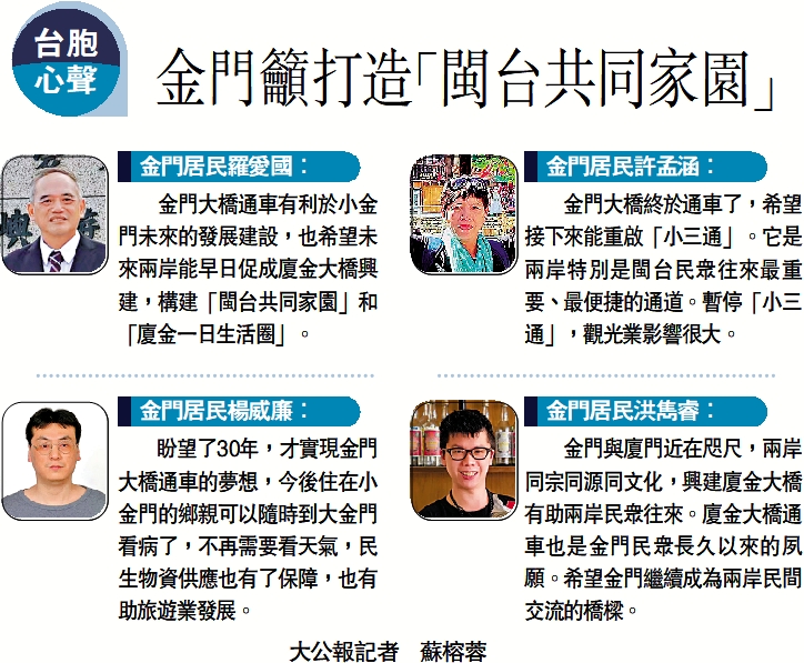 金門大橋通車有利於小金門未來的發展建設,也希望未來兩岸能早日促成廈金大橋興建,構建「閩台共同家園」和「廈金一日生活圈」。