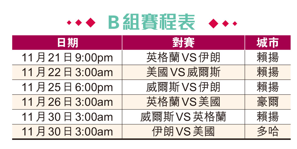 卡塔爾世盃B組有不少港人支持的英格蘭在其中,同組則有3支實力相當球隊,包括美國、威爾斯與伊朗,在假設「三獅兵團」能順利拿下首名後,次名之爭肯定激烈。不過,英軍在飽受傷兵及狀態反覆情況下,今屆要實現重奪冠軍美夢,相信亦會遇上重大阻力。