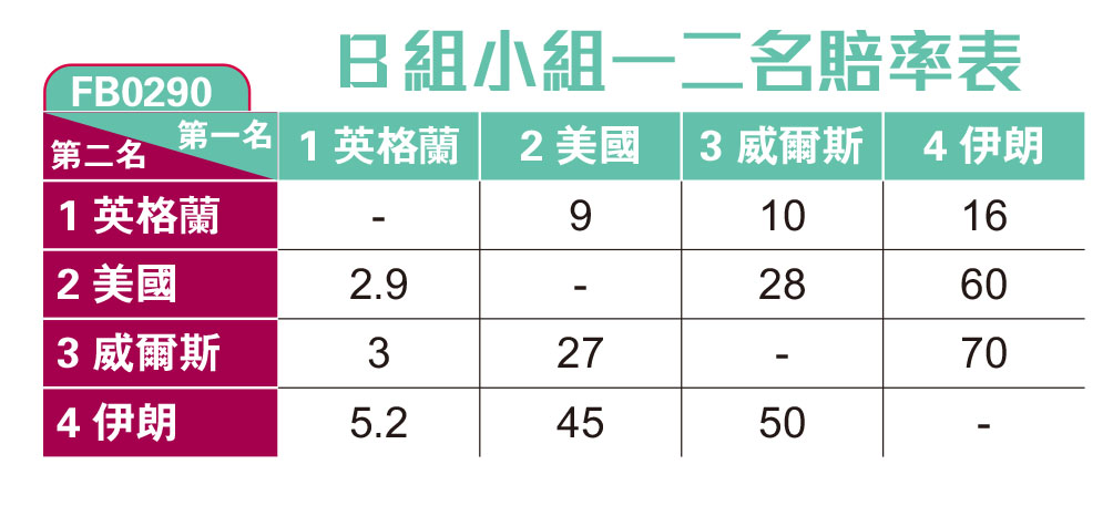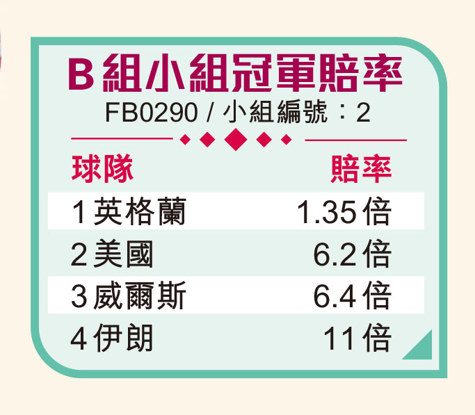 至於被視為小組最弱的伊朗,已是歷來第6次出戰決賽周,近年愈來愈多球員外流歐洲搵食,戰力提升不少,假如威爾斯與美國有任何閃失,最終能首度突破分組賽亦不出奇,喜歡敲冷朋友亦可一試「英伊」組合。