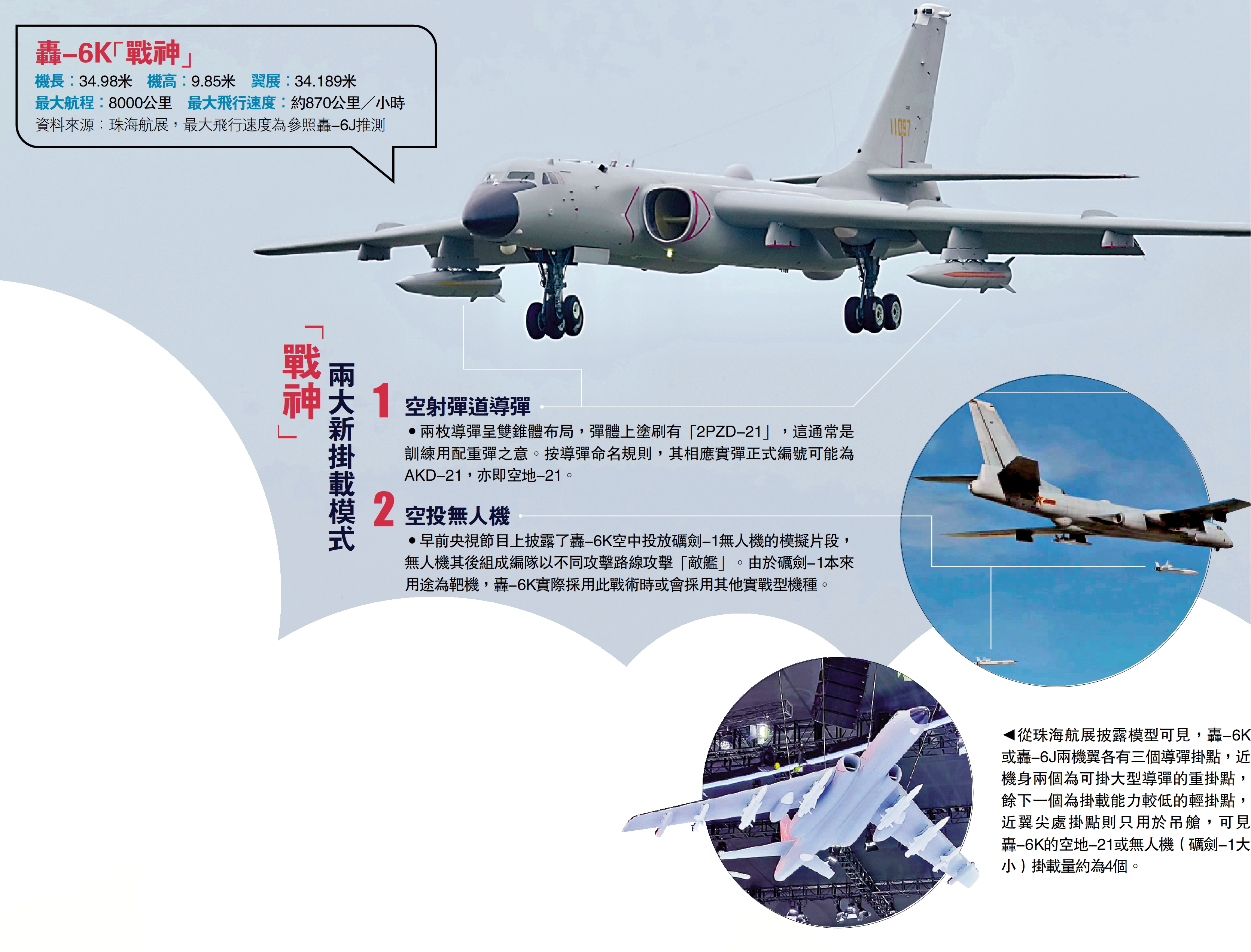 「戰神」轟-6K轟炸機早前首次掛載兩枚新型高超音速導彈亮相珠海航展。這是繼今年4月份轟-6N空射鷹擊-21D反艦彈道導彈之後,解放軍曝光的第二種空射型彈道導彈,極大提升了空軍遠程突防打擊能力。加上早前央視披露的「戰神」空中放飛戰術無人機組功能,轟-6K已升級為一個既可以打擊機場、指揮所、堅固碉堡群等高價值目標,也可以打擊水面艦艇的複合型遠程空中利刃。\馬浩亮(文)