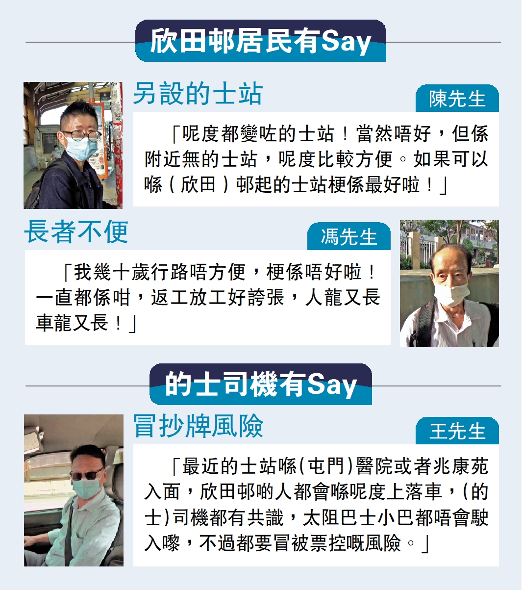 「最近的士站喺(屯門)醫院或者兆康苑入面,欣田邨啲人都會喺呢度上落車,(的士)司機都有共識,太阻巴士小巴都唔會駛入嚟,不過都要冒被票控嘅風險。」