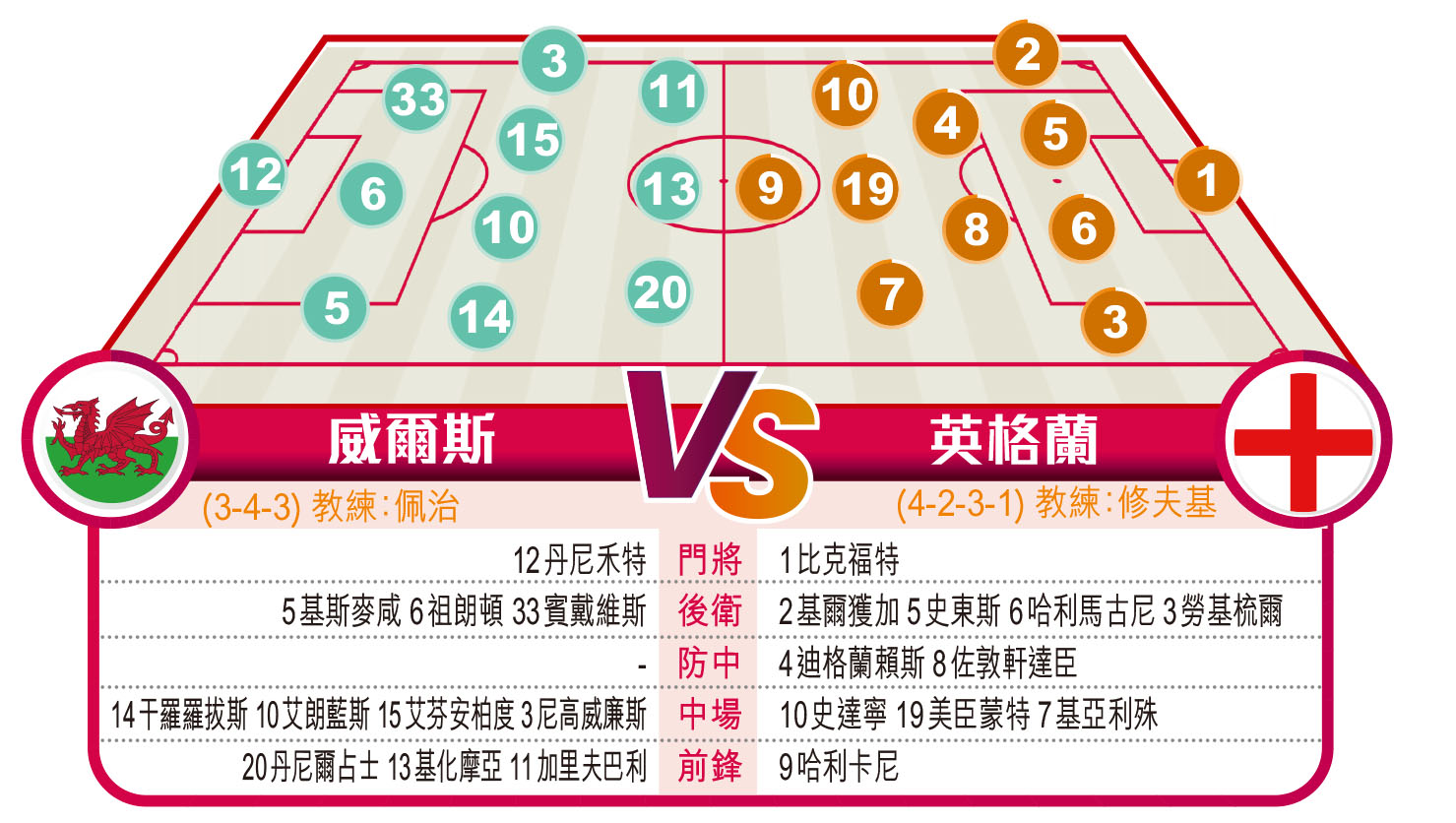 此外,天才中場祖迪比寧咸上場對美國表現失準,有傳修夫基或會讓其先任後備,改以利物浦中場佐敦軒達臣頂上;而防線右閘則會以傷癒的基爾獲加頂替捷比亞擔正。考慮英軍各項賽事近8戰只得1勝,同樣需要再一場大捷振奮軍心,今場對戰一向睇唔順眼的「細佬」威爾斯,肯定不會留手,有望大捷。