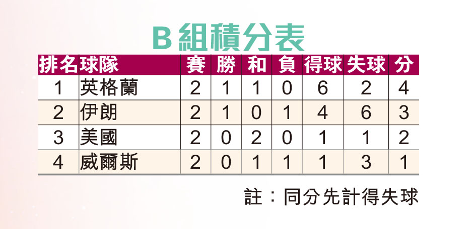 另邊廂,英格蘭在首戰大炒伊朗後,上場面對美國的表現卻打回原形,最終雙方互交白卷,令人失望。「三獅兵團」上場賽後被狂迷喝倒彩,進攻線發揮尤其令人失望,不過來自英媒消息指,一向領軍手法保守的主帥「南閘」修夫基,對陣容不會作大變動,即使中場占士麥迪臣經已傷癒,球迷網民亦不斷公開要求派出菲爾科頓擔正,但預計「南閘」都會實行以不變應萬變,前線會續以隊長哈利卡尼與史達寧帶領,唯一是小將布卡約沙卡或會被收起,改以基亞利殊擔正,而菲爾科頓恐怕仍會先任後備。