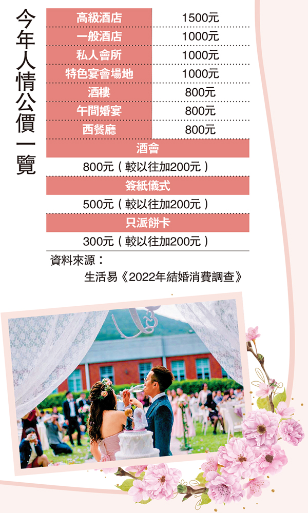 又到年尾結婚佳期,相信不少人都收到「紅色炸彈」,到底疫情之下,結婚花費要多少?人情應該給多少?鄭晴留意到,近日有網站公布最新結婚消費調查,顯示新人結婚平均開支連跌兩年後,今年按年飆升9%至38萬元,在酒店、酒樓擺酒的人情公價無明顯加幅,但參與酒會、簽紙儀式的人情中位數則上升約三成及六成,想結婚或者準備給人情的朋友可以參考一下啦!