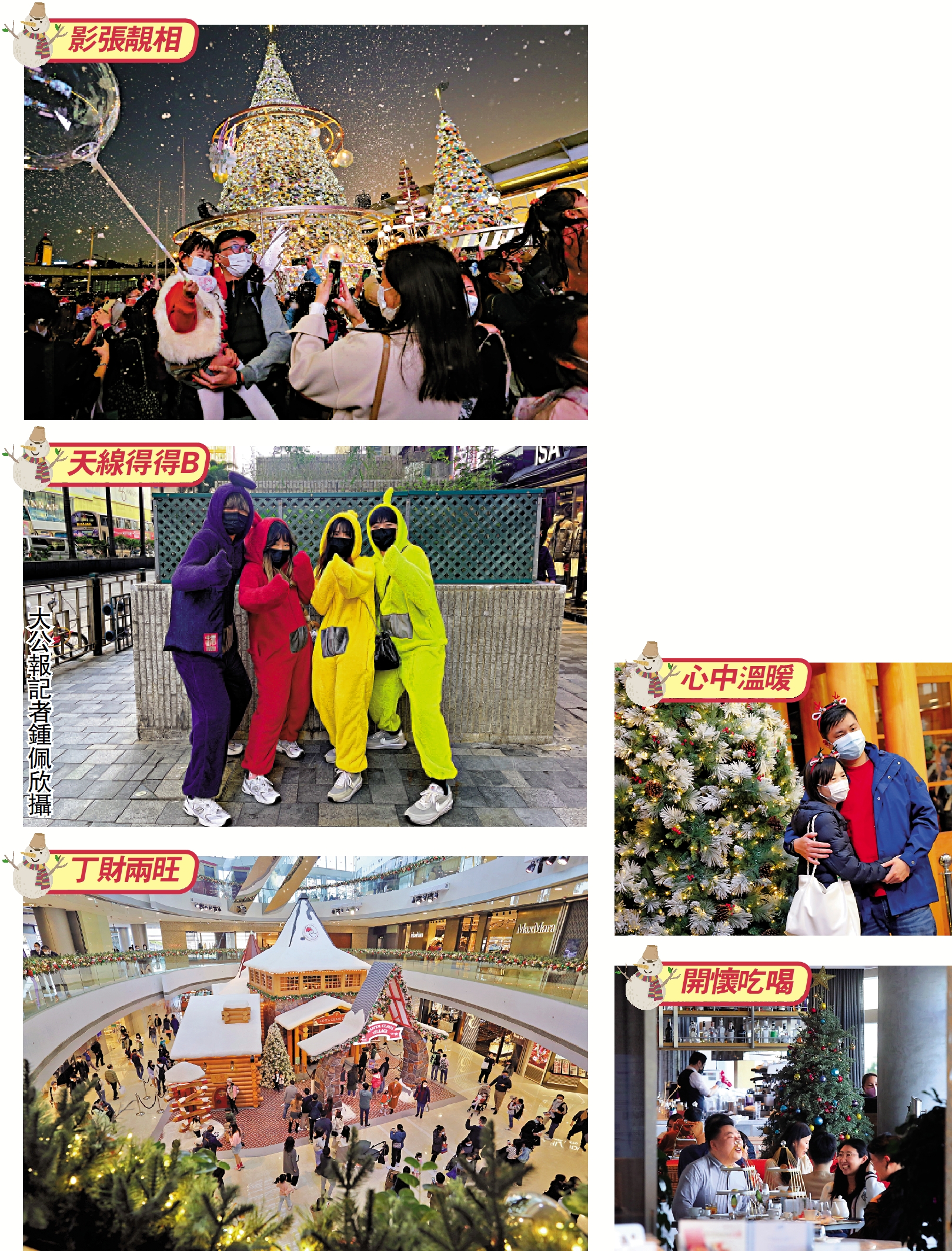 在尖沙咀海港城的大型聖誕布置、平安夜在廣場的特別「飄雪」,吸引大小朋友齊齊「打卡」,大人、小朋友的頭上都「長出」鹿角,或戴上小型聖誕帽,與街上聖誕布置融為一體。有情侶打扮成「天線得得B」,他們說一般的聖誕老人打扮太過「小兒科」,希望打扮得難忘一點,並打趣說平安夜大餐是「回去天線得得B基地叫外賣」。