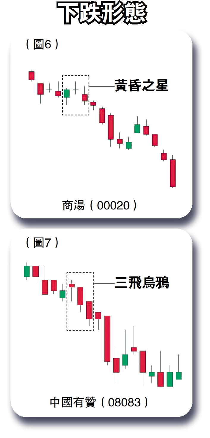 到了第三根陰陽燭則是跌勢明顯的大陰燭,沽盤十分強勁,可以看到「黃昏之星」的陰陽燭排列只是「早晨之星」的相反排列。但每當「黃昏之星」這個形態出現,股價繼續下跌的機會便較大。如商湯(00020)在今年9月底便出現「黃昏之星」形態(見圖6),股價其後由約1.9元一直跌至約1.2元。