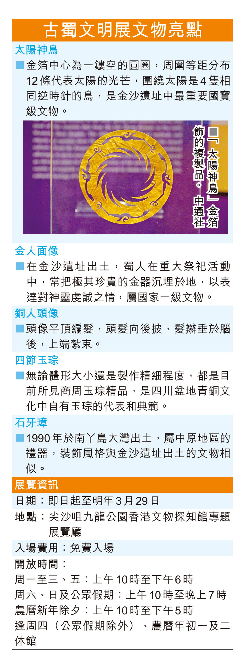 元旦臨近,又有國寶級文物首次在港展出。由香港文物探知館舉辦的「金沙之光─古蜀文明展」今日(30日)起一連三個月展出逾70件來自金沙遺址的國家級文物,同場還有7件香港出土文物展出。在眾多展品中,有14件為一級國家文物,包括「太陽神鳥」及金人面像等,揭示4千年前古蜀的高度文明。