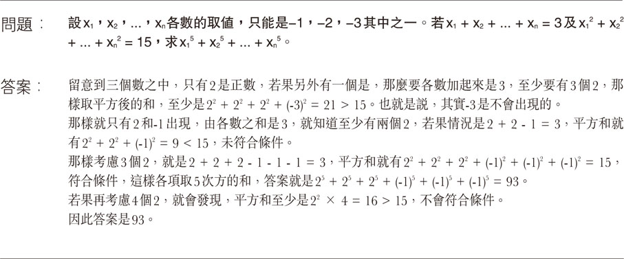 解題的過程中,主要是留意到取值裏只有一個正數,然後就看出負數中有-3的話,就會多了幾個正數2,之後的平方和就很快超過了限制,於是2又不能太多個,很快就試到了答案。要是重點錯置了,一時又試試有多少個之類的,可能會變得麻煩很多。