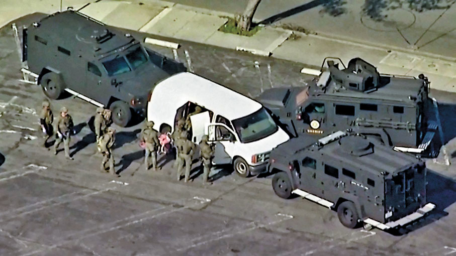 洛杉磯警方在追捕疑兇過程中,出動精銳的特殊武器和戰術小組追捕,並動用具有堅強防護力的「熊貓」(BearCat)裝甲車,包圍疑兇的白色小型客貨車(圖)。