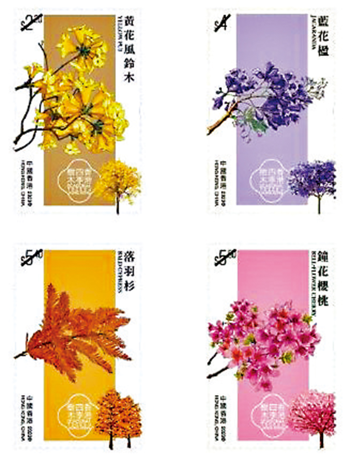 香港郵政昨日宣布,推出以「香港四季樹木」為題的特別郵票及相關郵品,該套郵選取了四種極具季節特色的本地常見樹木,包括春天盛開的黃花風鈴木、夏天綻放的藍花楹、秋天泛金的落羽杉和冬天傲寒而立的鐘花櫻桃(上圖)。