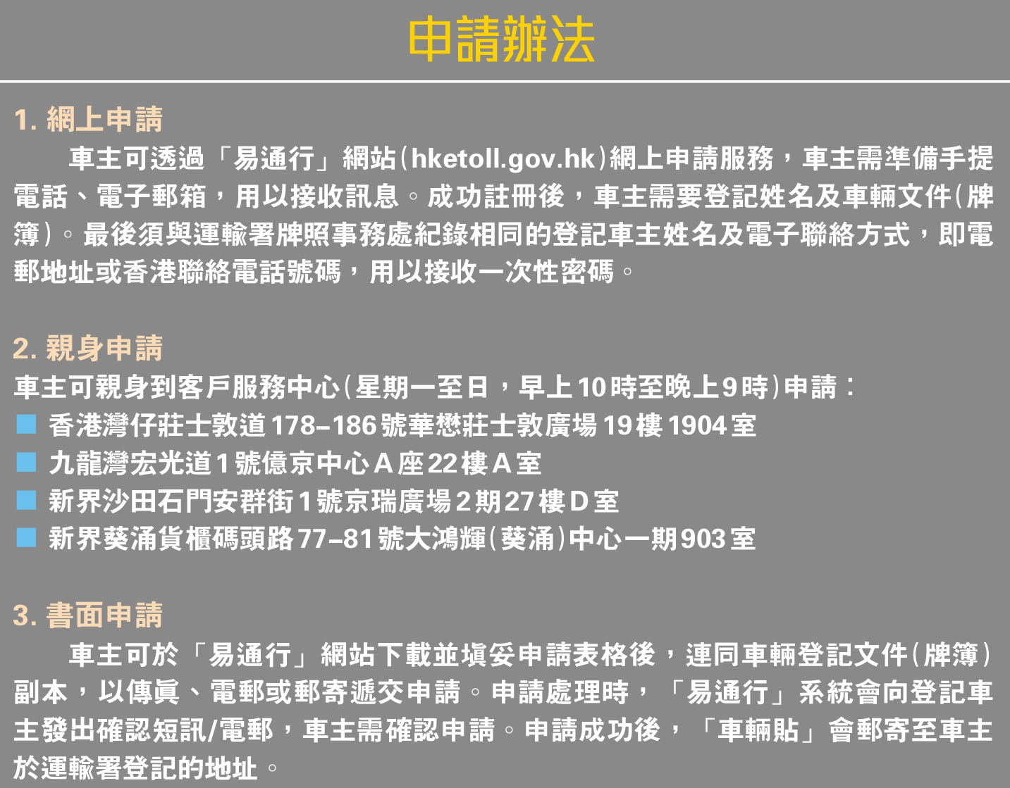 隧道費服務供應商需約5個工作天處理「車輛貼」申請,登記車主請預留足夠時間申請。
