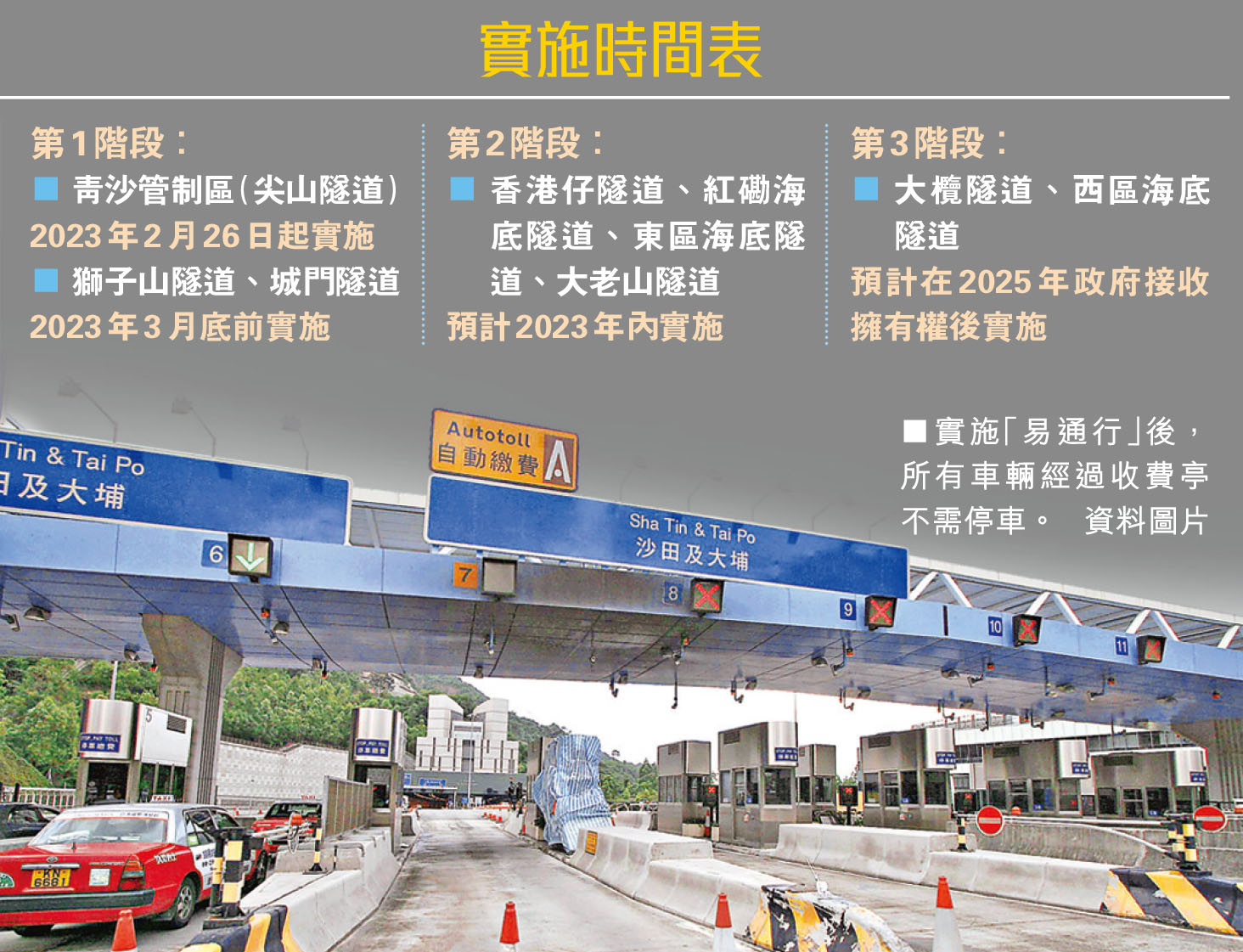 政府推廣隧道「易通行」電子收費計劃,本月26日上午5時起,於青沙管制區實施,屆時所有人手收費亭及「快易通」車道將會取消,駕駛人士可透過「車輛貼」遙距繳付隧道費,無須於收費亭停車或排隊付款。而今年3月底前則在城門隧道及獅子山隧道實施,其他政府收費隧道會陸續在稍後時間推行,全面取代人手及自動收費亭。為方便駕車人士,本報整理出「易通行」的資料及申請方法,給司機作參考。