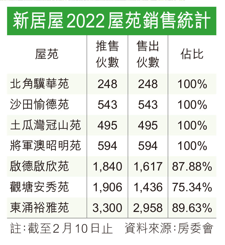 房屋委員會(房委會)「出售居者有其屋計劃單位2022」(居屋2022)截至上周五(10日)累計售出8,306伙,佔單位總數約93%;上周五當日有約2,300位綠表家庭申請者獲邀揀樓,有233人到場,結果全日賣出44個單位。全數綠表家庭申請者已獲邀揀樓,由於配額未用盡,將撥予白表家庭申請者。房委會昨日再邀請約300位白表家庭申請者揀樓。