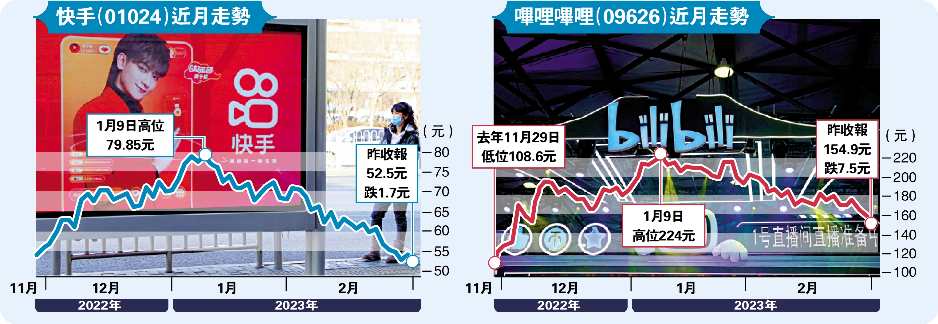 B站昨日力守150元關口,午後跌至150.9元喘定,收報154.9元,跌4.6%,是科技指數跌幅之首。快手低見51.9元,收市跌逾3.1%至52.5元。