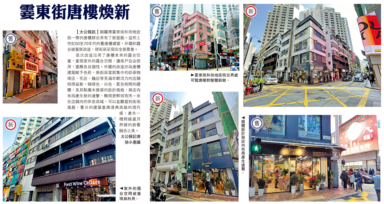 【大公報訊】銅鑼灣霎東街和勿地臣街一帶的唐樓群近來有了新面貌。這些上世紀50至70年代的舊唐樓建築,外牆和露台被重新改造,使街區呈現出全新景象。