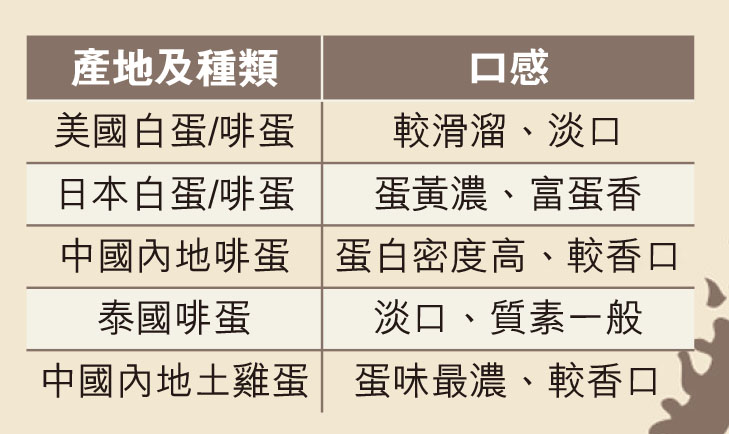 本港市面上售賣的雞蛋可謂五花八門,平日街市最常見的啡蛋,有來自中國內地、美國、泰國及日本,而美國及日本亦有白蛋出產;土雞蛋則主要在中國內地生產。至於一般餐廳食肆選用中國內地啡蛋、中國內地土雞蛋及美國白蛋較多。