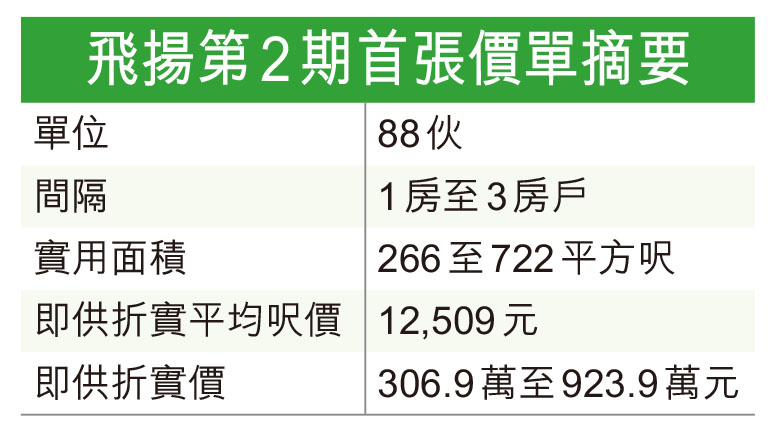 飛揚第2期首張價單包括51伙一房戶、32伙兩房及5伙三房,其中一及兩房即供最高折扣15%,三房即供最高折扣17%,即供折實呎價11,042元至13,972元,全數一房戶即供折實價低過400萬元。