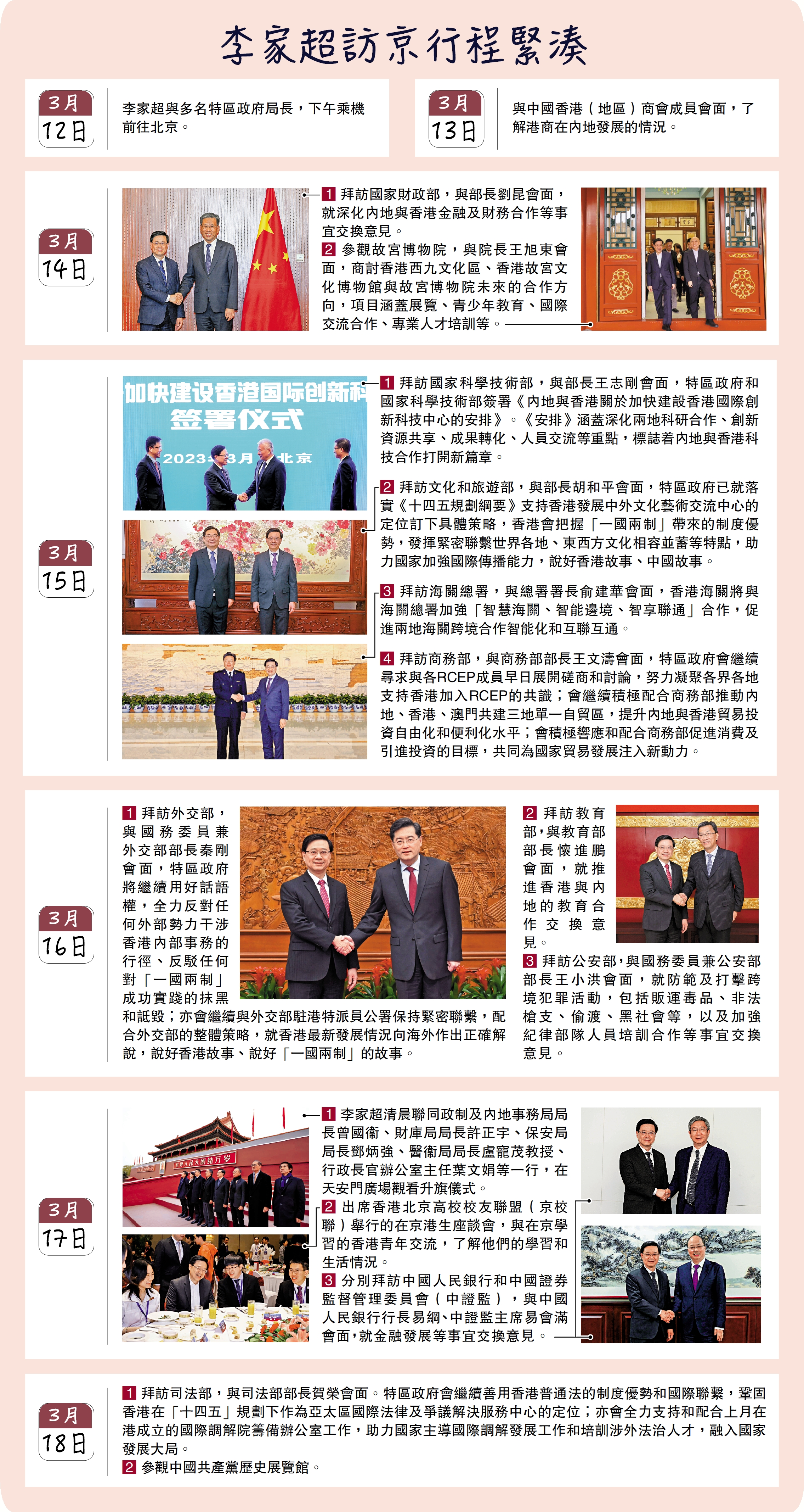1 拜訪國家科學技術部,與部長王志剛會面,特區政府和國家科學技術部簽署《內地與香港關於加快建設香港國際創新科技中心的安排》。《安排》涵蓋深化兩地科研合作、創新資源共享、成果轉化、人員交流等重點,標誌着內地與香港科技合作打開新篇章。
