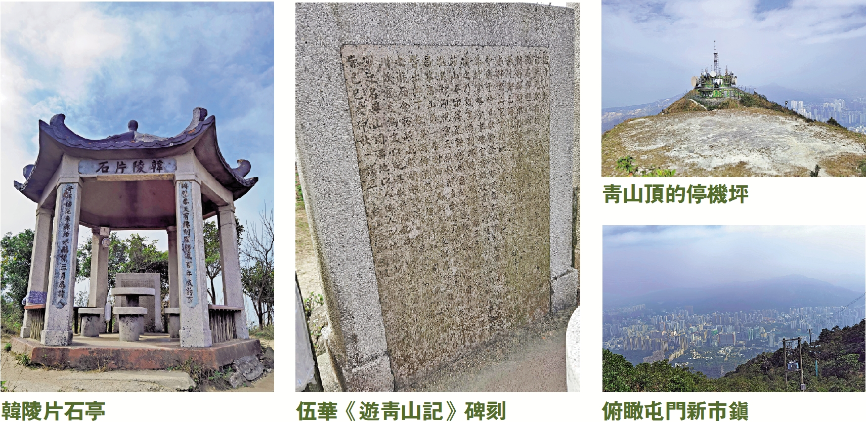 頂峰之下有一處山坳,韓陵片石亭就在這裏,這是為紀念唐代韓愈「高山第一」題字而建。這四字原刻在發射站的巨岩下,傳說是韓愈被貶潮州途經屯門時所遺墨寶,四字旁有「退之」二字,後人以山頂石刻斑駁難辨,拓印重刻於杯渡岩旁。亭內的石碑刻有伍華所撰的《遊青山記》,記述他追隨金文泰二遊青山的經歷,文中用「制軍」、「元勳宿將」、「出守雄藩」等來寫金文泰「來鎮香港」的功績。華人縉紳們對英人抱着「夷狄入中國則中國之」的心態,這不免自欺欺人。從青山絕頂俯瞰青山腹地,視野非常遼闊,那無數曲折高低的山脊,行山者已經踩踏出犬牙交錯的山路,像煞一個巨大的軍事沙盤,給人無限蒼茫之感。