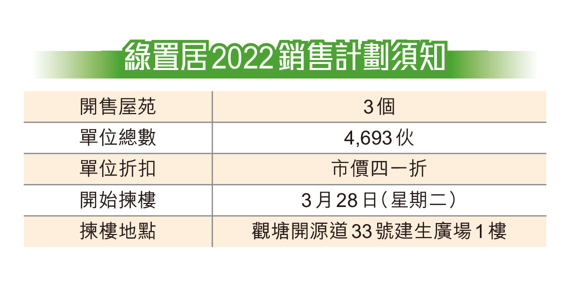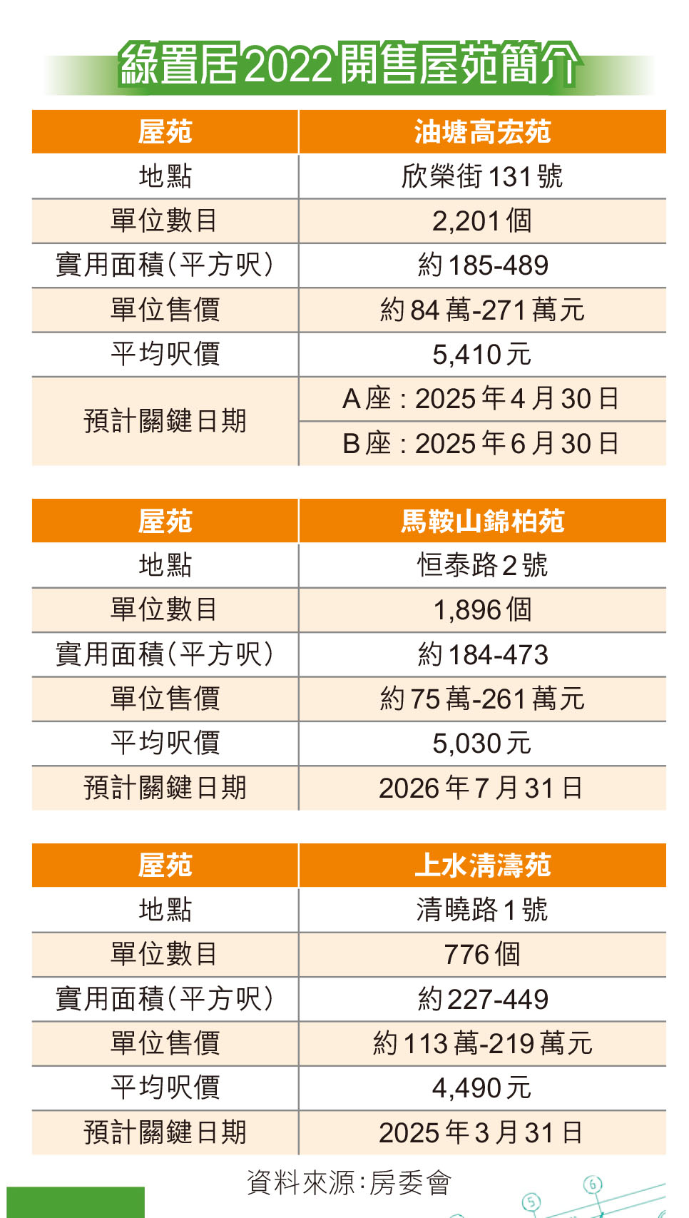 房委會於今期綠置居項目包括油塘高宏苑及馬鞍山錦柏苑。當中於油塘高宏苑共有19%的單位屬於面積最小的類別、即185至223平方呎,另有38%的單位為278至333平方呎。而馬鞍山錦柏苑則有8%的單位為184至185平方呎,並有45%的單位為278至288平方呎,意味着仍有超過一半單位面積小於300平方呎。而上水清濤苑同樣有一半單位面積小於290平方呎。