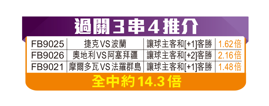 至於F組奧地利主場對阿塞拜疆,由名帥蘭歷克帶領的主隊,近年人腳老化,今場雖有地利,只是可勝不穩,反觀阿塞拜疆各項賽事近5戰全勝,今場應不會大敗,「讓球主客和」[+2]客勝相當抵玩。(開賽時間:周六3:45am)