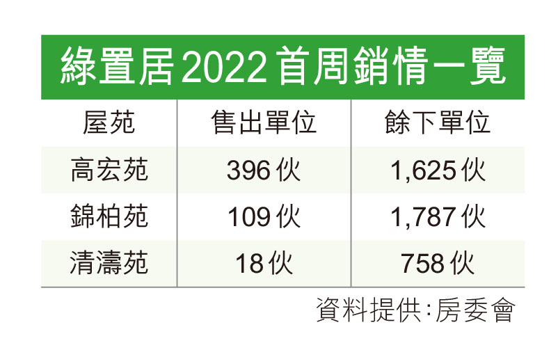 綠置居2022以市價四一折推售油塘高宏苑、馬鞍山錦柏苑及上水清濤苑合共4,693伙,售價約75萬元至271萬元不等,自3月28日開始揀樓至4月4日的首周內,三個屋苑累售523伙,首周平均揀樓率(出席人數可揀樓比率)僅為62.4%,較過往平均揀樓率70%更低。