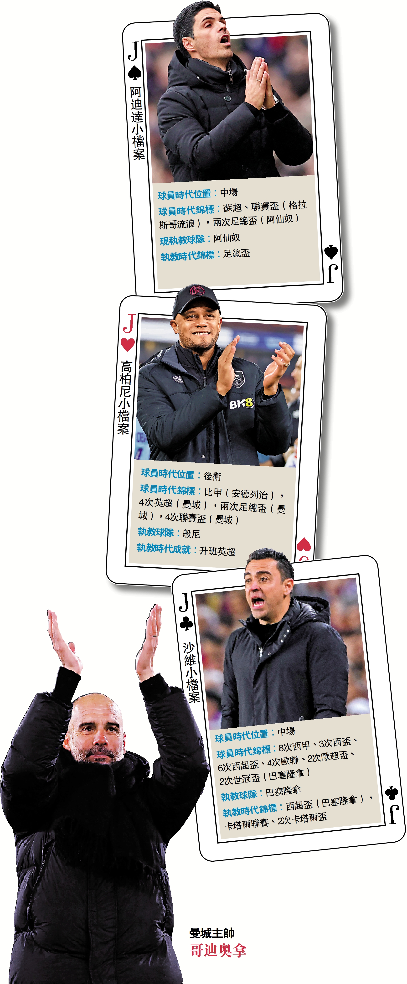 西班牙籍名帥哥迪奧拿,是足球壇近年的戰術大師,他的「Tiki-Taka」戰術改變現代足球風格,他帶領的球隊也取得不少獎盃。哥帥多年執教以來桃李滿門,不少弟子已在各隊成為主帥,目前更有阿仙奴主帥阿迪達、巴塞隆拿主帥沙維及般尼主帥高柏尼3人,在各自領軍的聯賽排名榜首。當中阿迪達今季成績超越師傅,很大機會助阿仙奴捧得久違的英超冠軍、沙維成為哥帥在巴塞的正式繼承人,高柏尼提前7輪鎖定英超升班席位,同是球壇一時佳話。\大公報記者 梁潤森